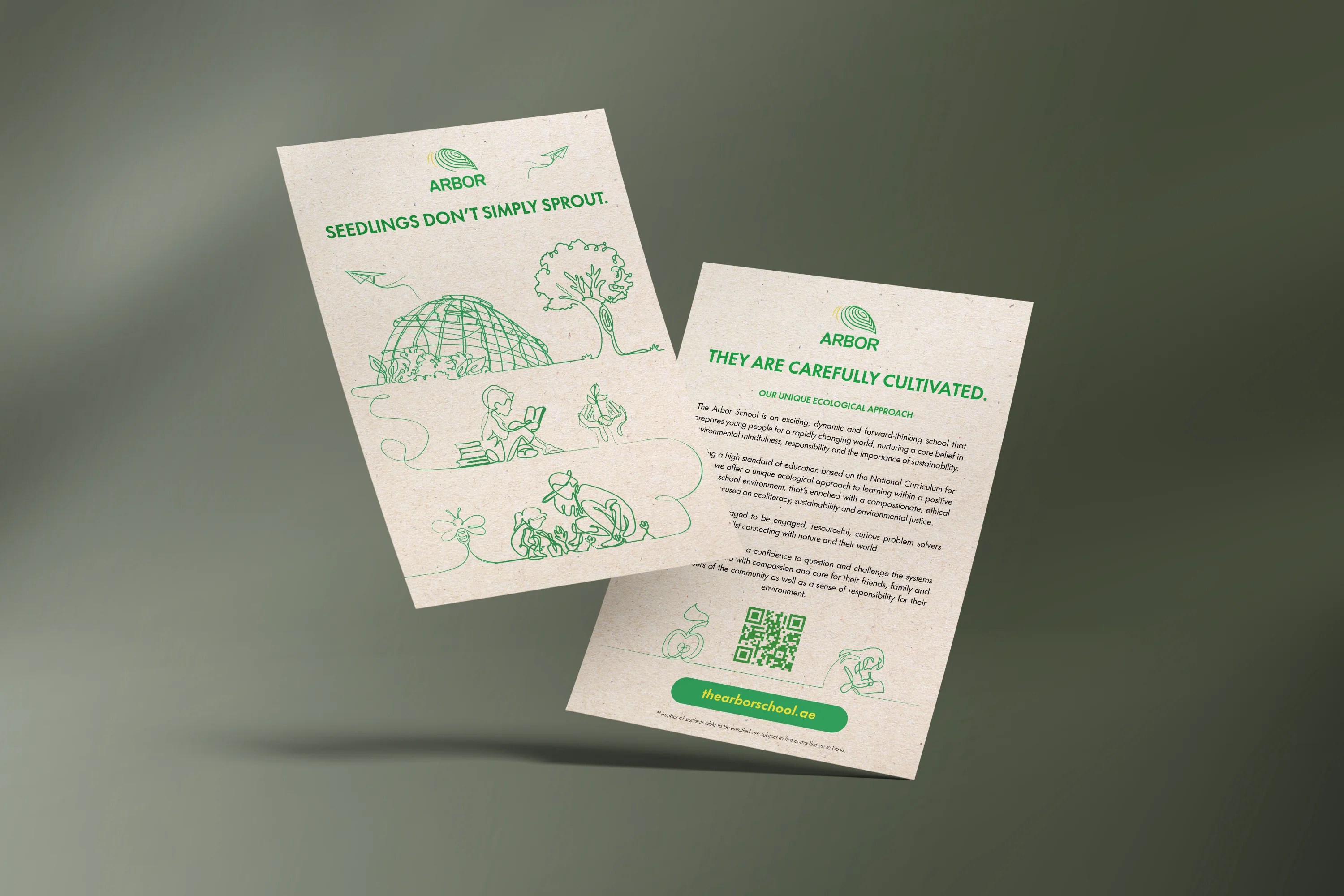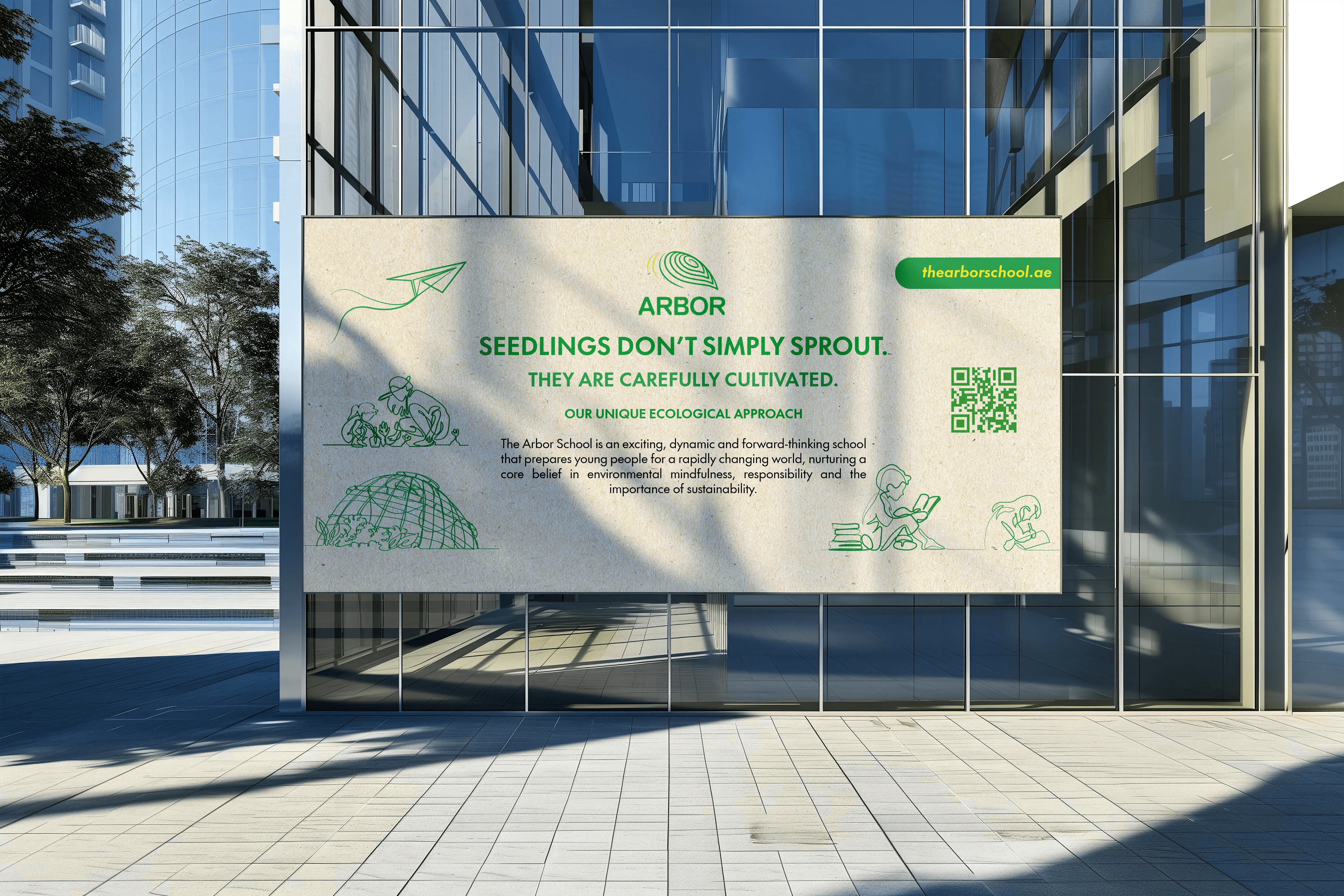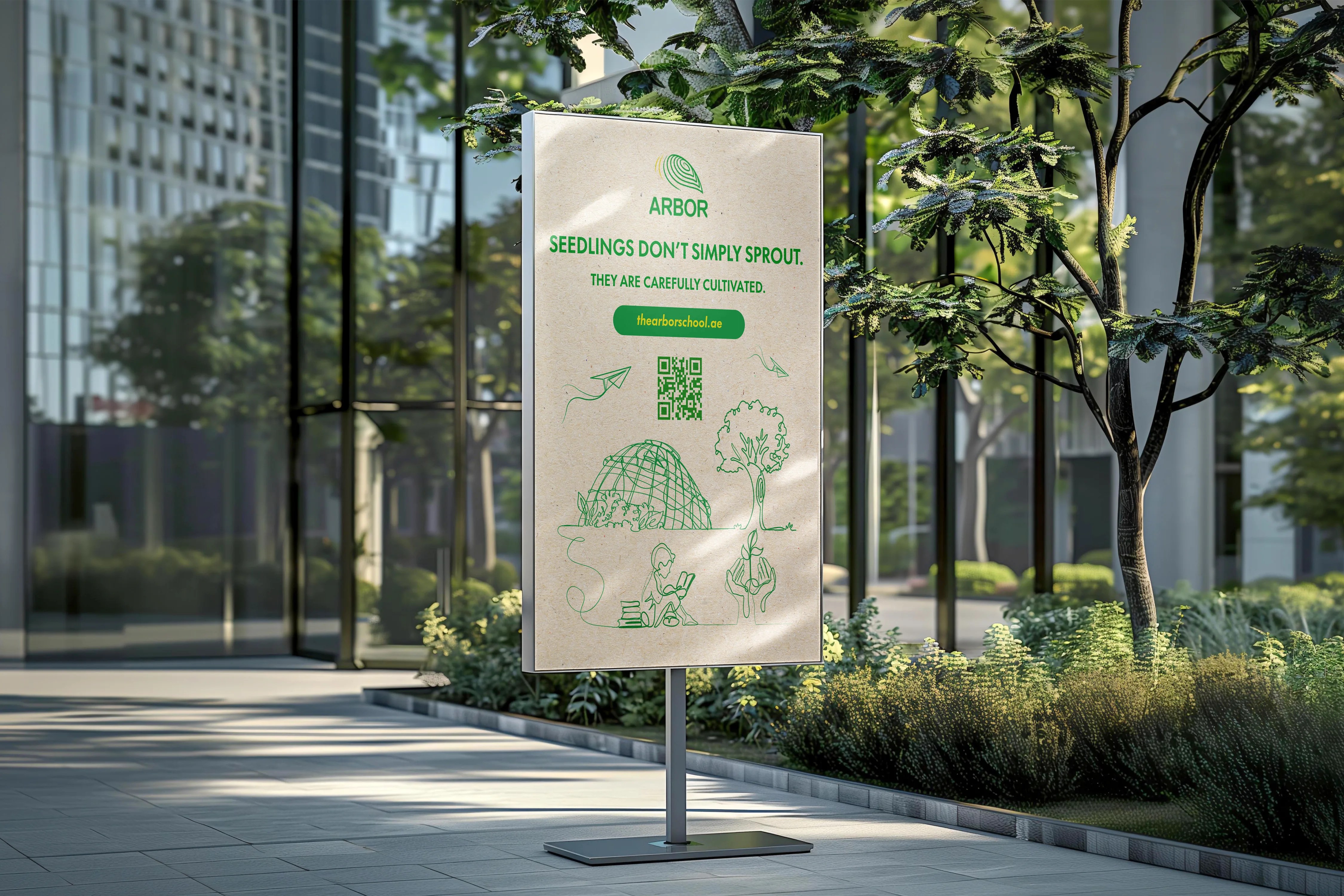 Custom illustrations have been created to highlight both the educational and environmental sustainability aspects of Arbor School. A thoughtful tagline, “SEEDLINGS DON’T SIMPLY SPROUT, THEY ARE CAREFULLY CULTIVATED,” reinforces the nurturing power of quality education and the importance of environmental awareness. These illustrations will be combined and used across print and digital platforms.