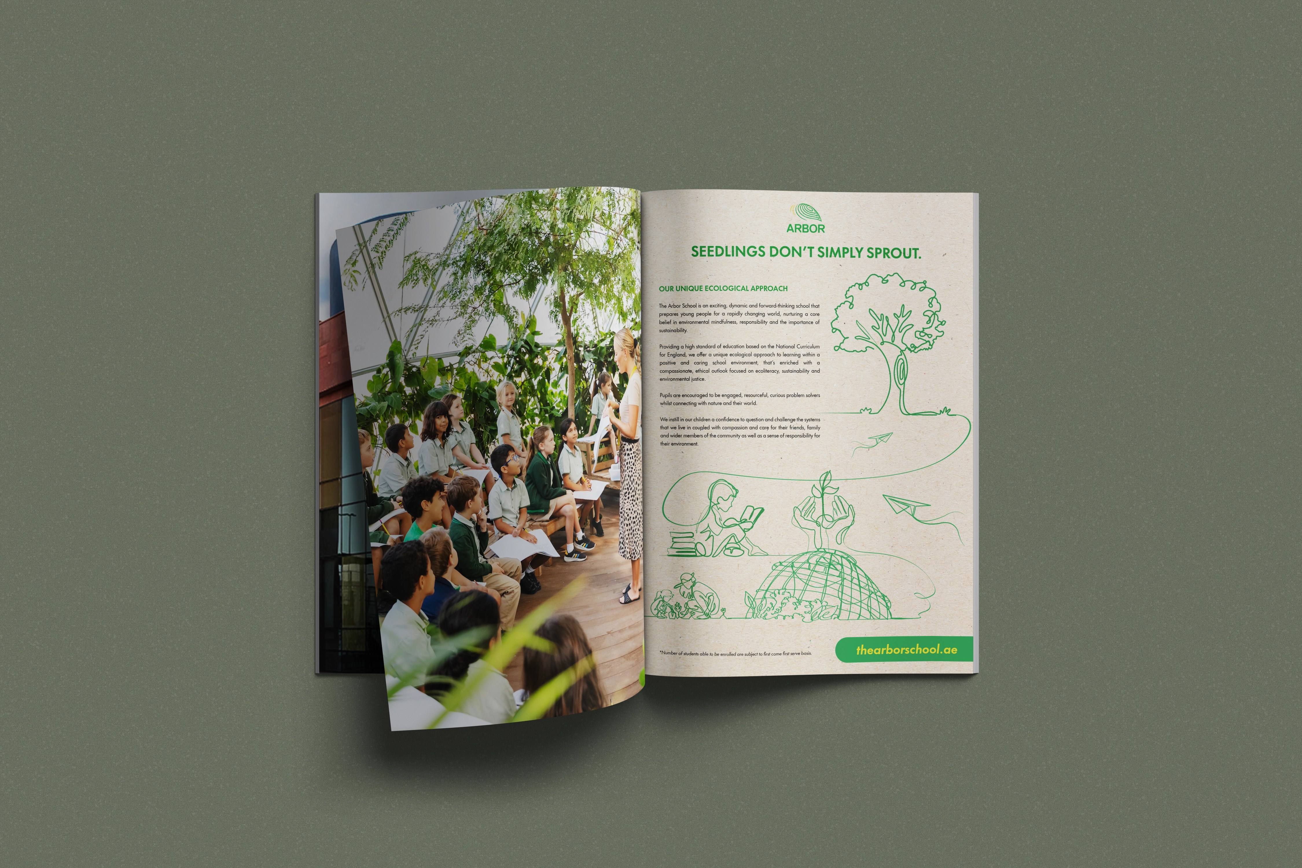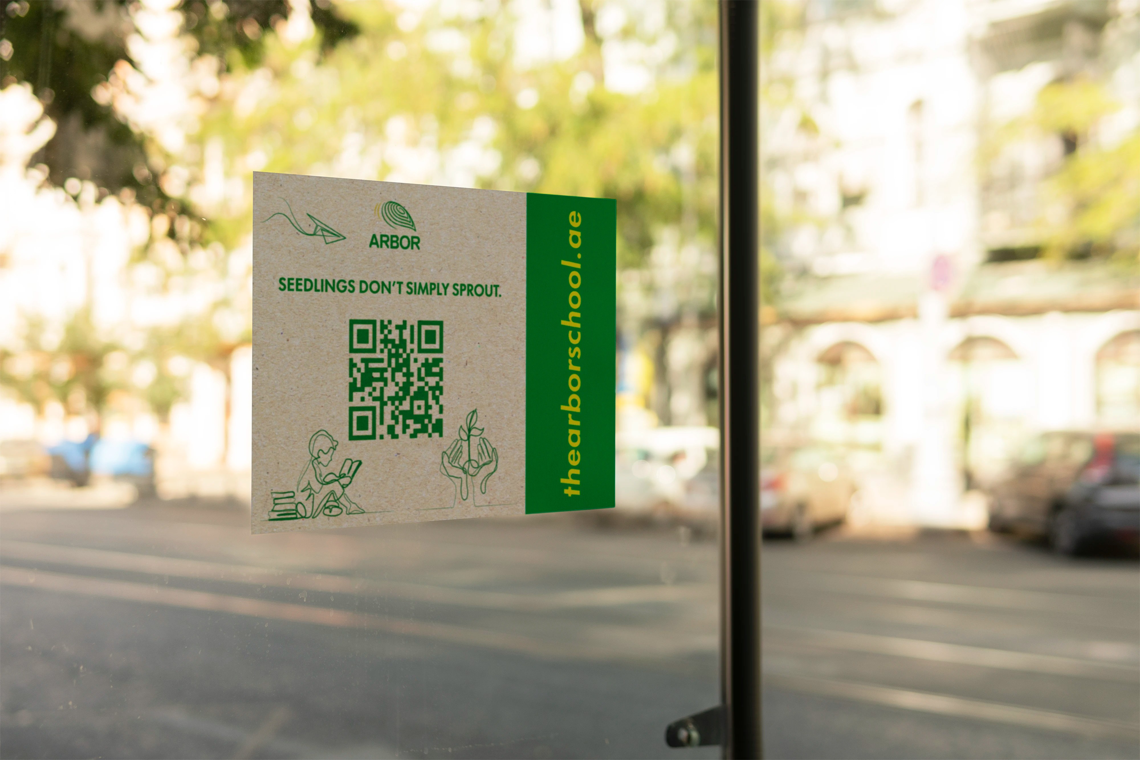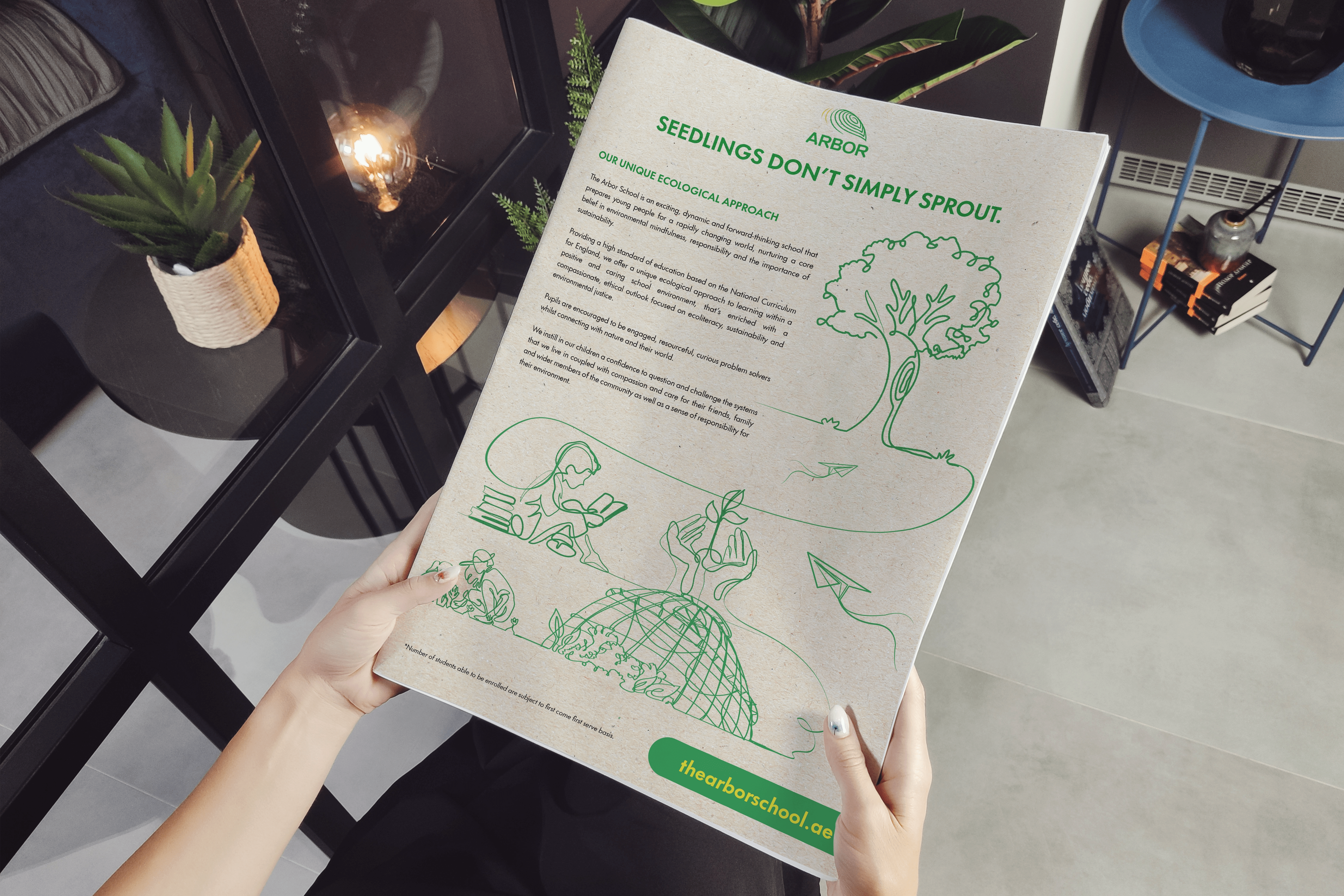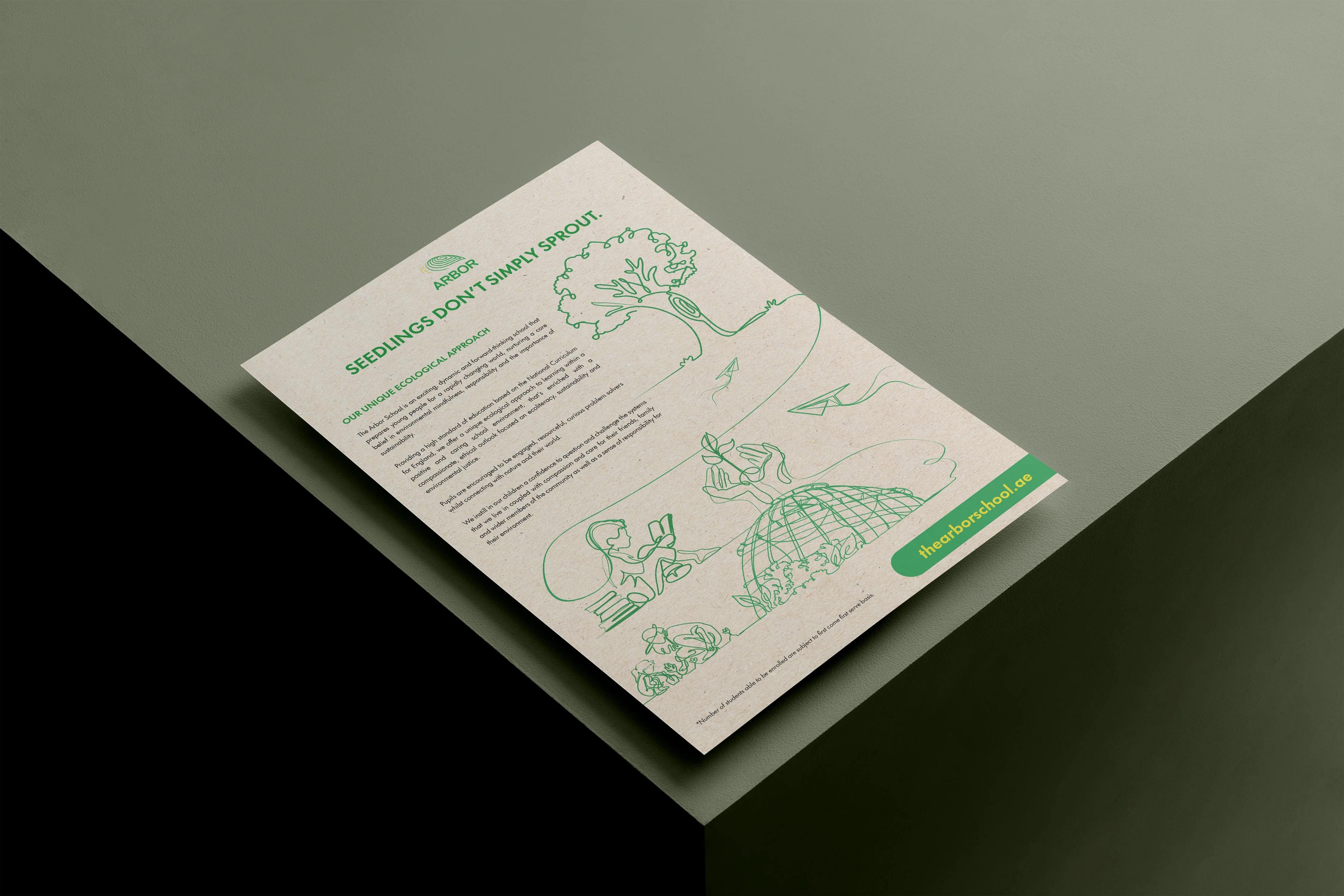 Custom illustrations have been created to highlight both the educational and environmental sustainability aspects of Arbor School. A thoughtful tagline, “SEEDLINGS DON’T SIMPLY SPROUT, THEY ARE CAREFULLY CULTIVATED,” reinforces the nurturing power of quality education and the importance of environmental awareness. These illustrations will be combined and used across print and digital platforms.