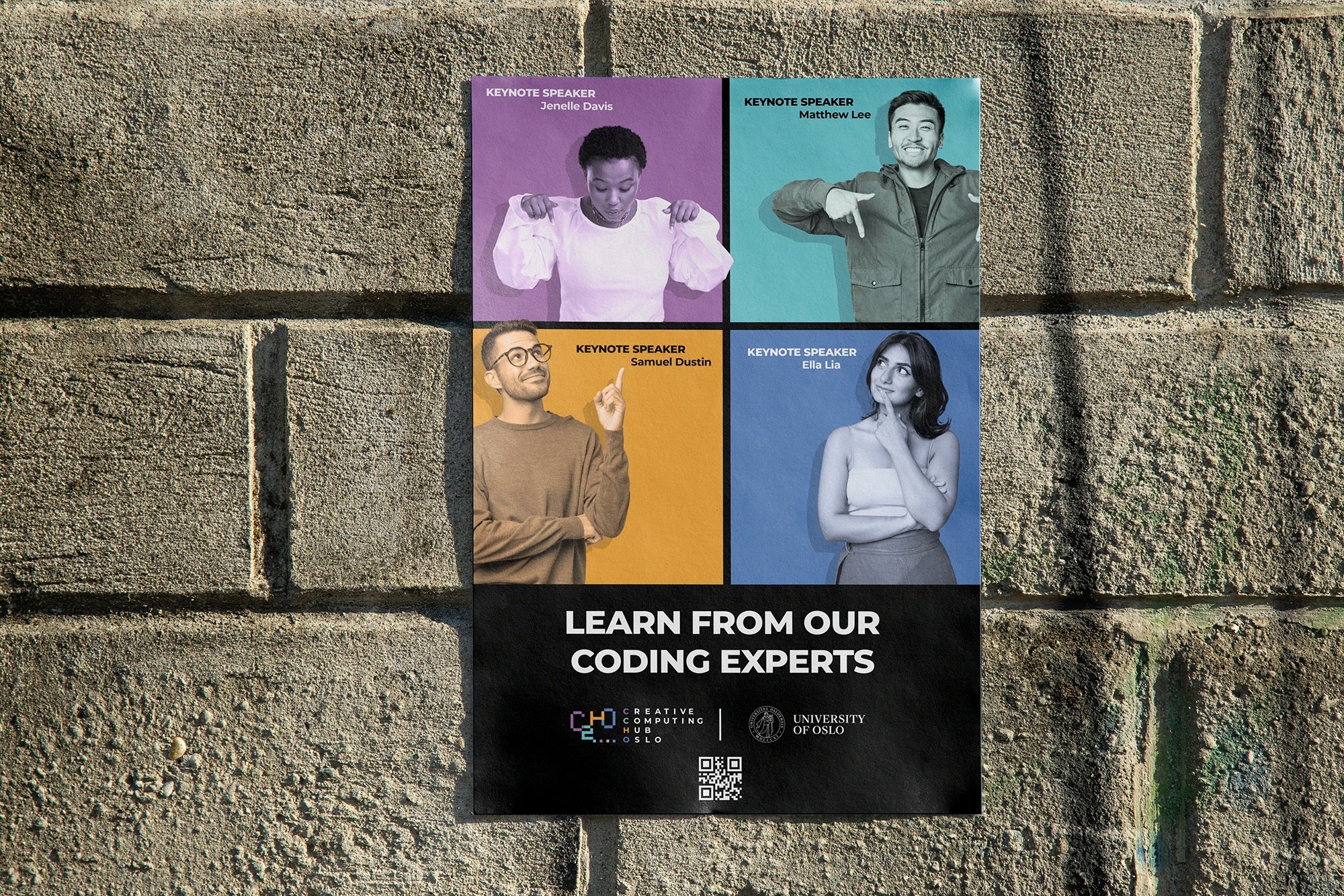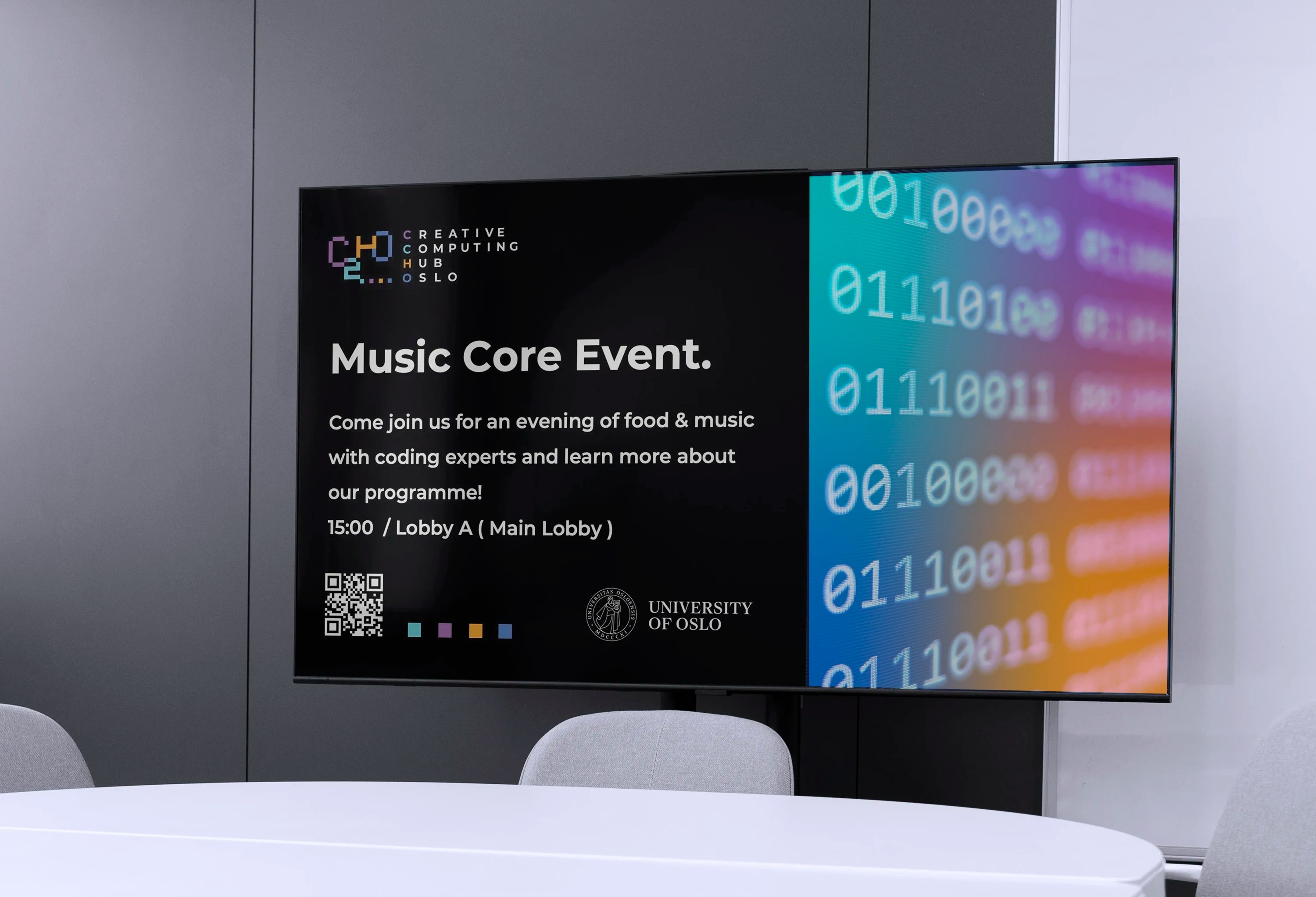 The colours were chosen to represent each of the entities of the logo respectively. Purple is used to represent full creativity, at its highest potential. Turquoise is used to represent high intelligence in computing. Orange is used to showcase the aspect of friendliness within community hubs, and lastly blue is used to signify the calm nature and coolness of Oslo.