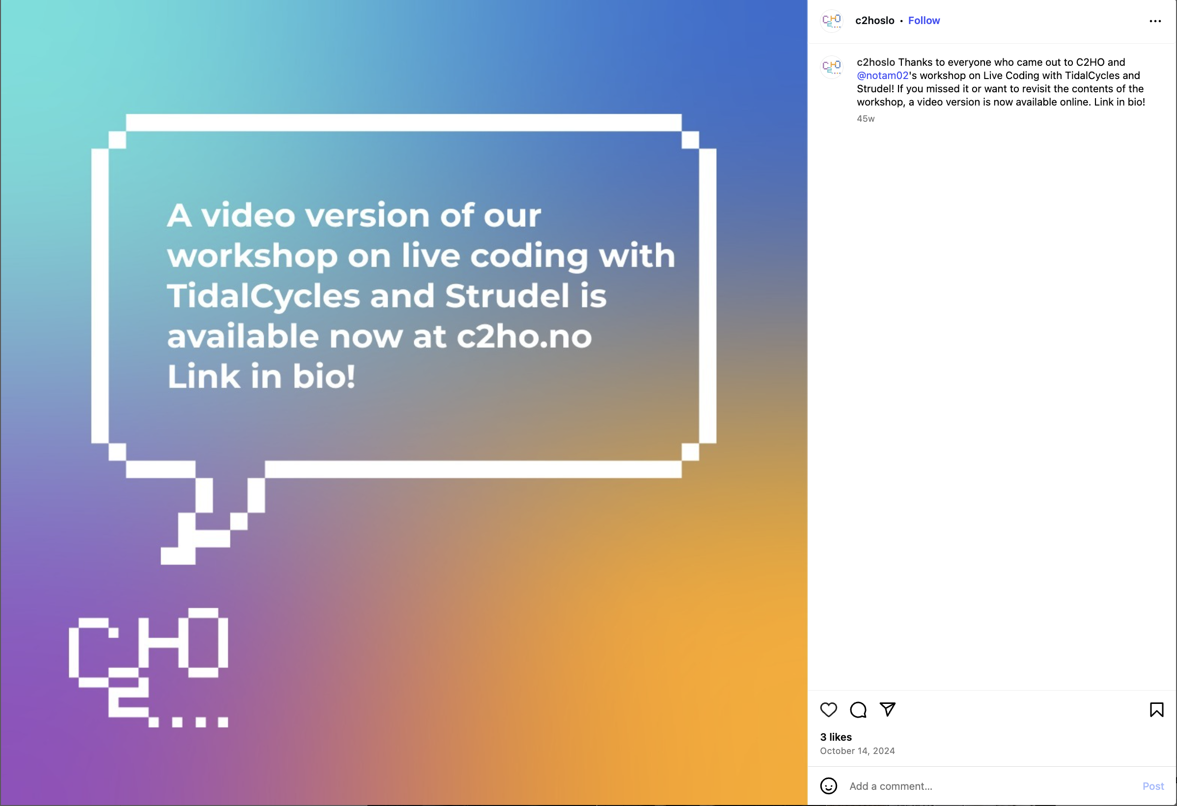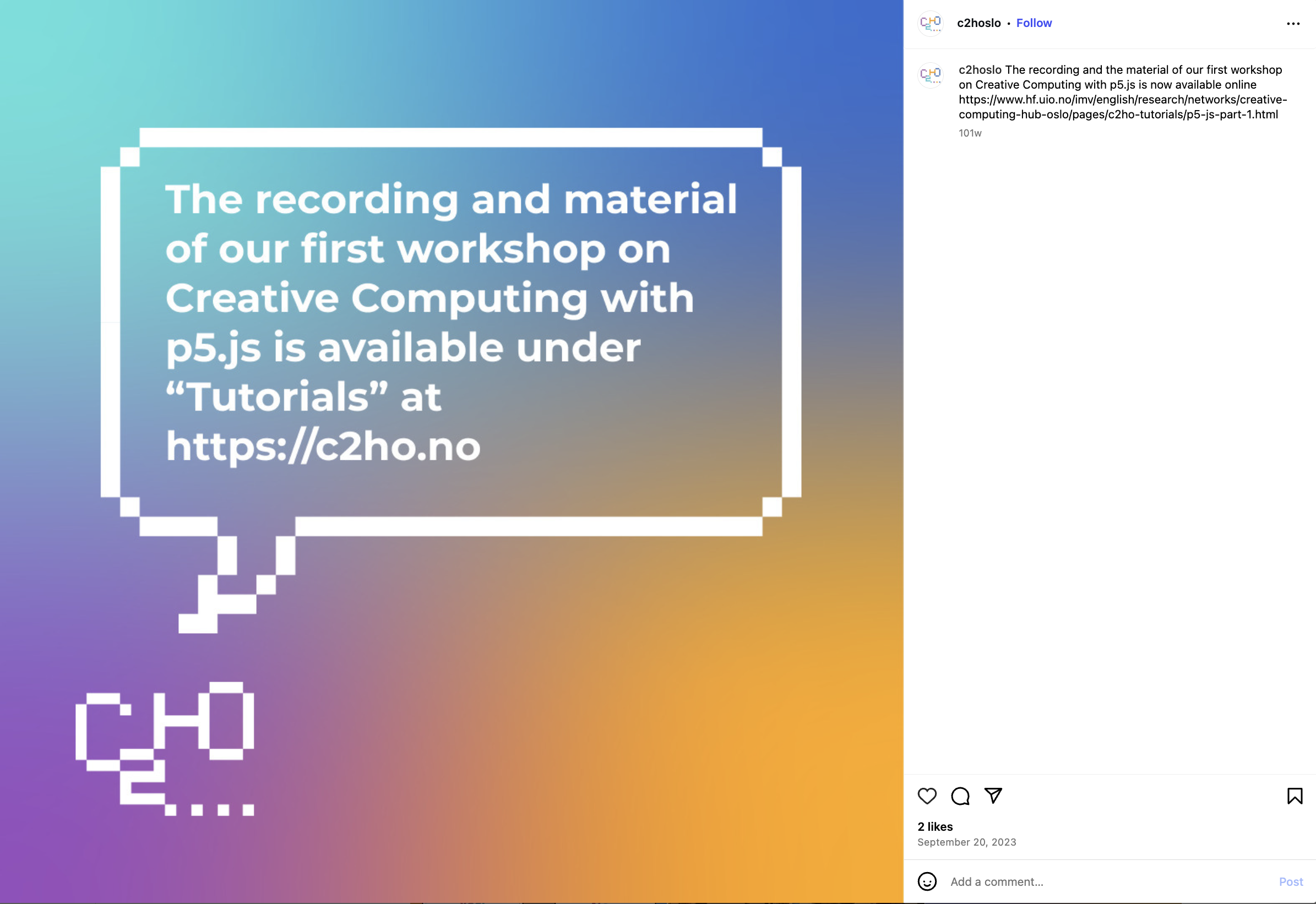 C2HO is an interdisciplinary international network for gathering and sharing relevant expertise and resources around creative computing. Part of the Musicology Department in the University of Oslo, Norway, it is a new programme aimed at teaching students about fun ways to fuse music and computer science as one.