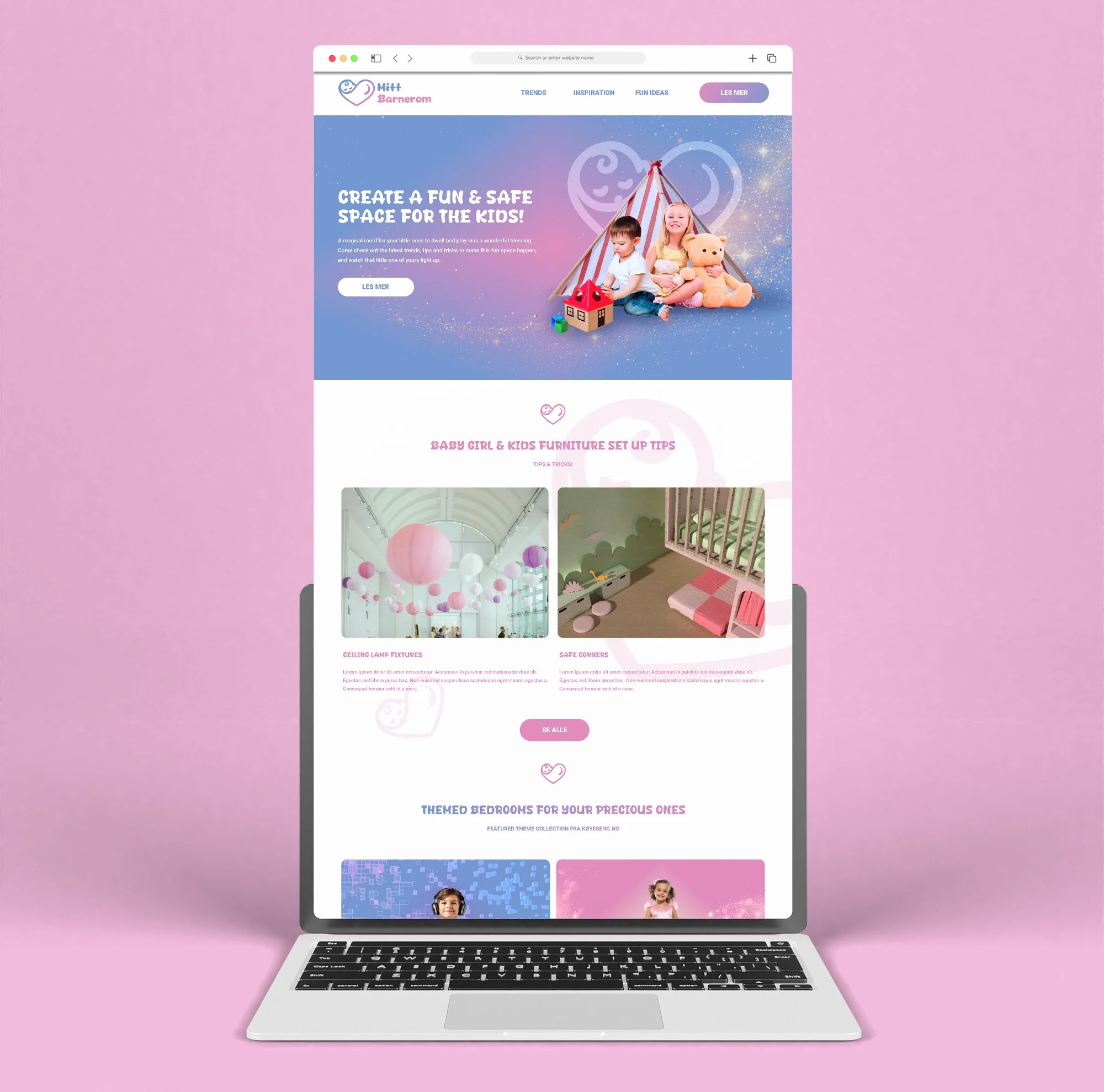 Mittbarnerom.no is a subsidiary webpage of Køyeseng.no, dedicated to children’s interior trends, insightful articles, and practical guides. Serving as an inspiration hub, it seamlessly directs viewers to Køyeseng.no and other trusted web shops for high-quality children’s furniture and décor. To enhance its brand presence, a fresh UI design and a thoughtfully crafted logo identity have been developed, ensuring a visually appealing and user-friendly experience.
