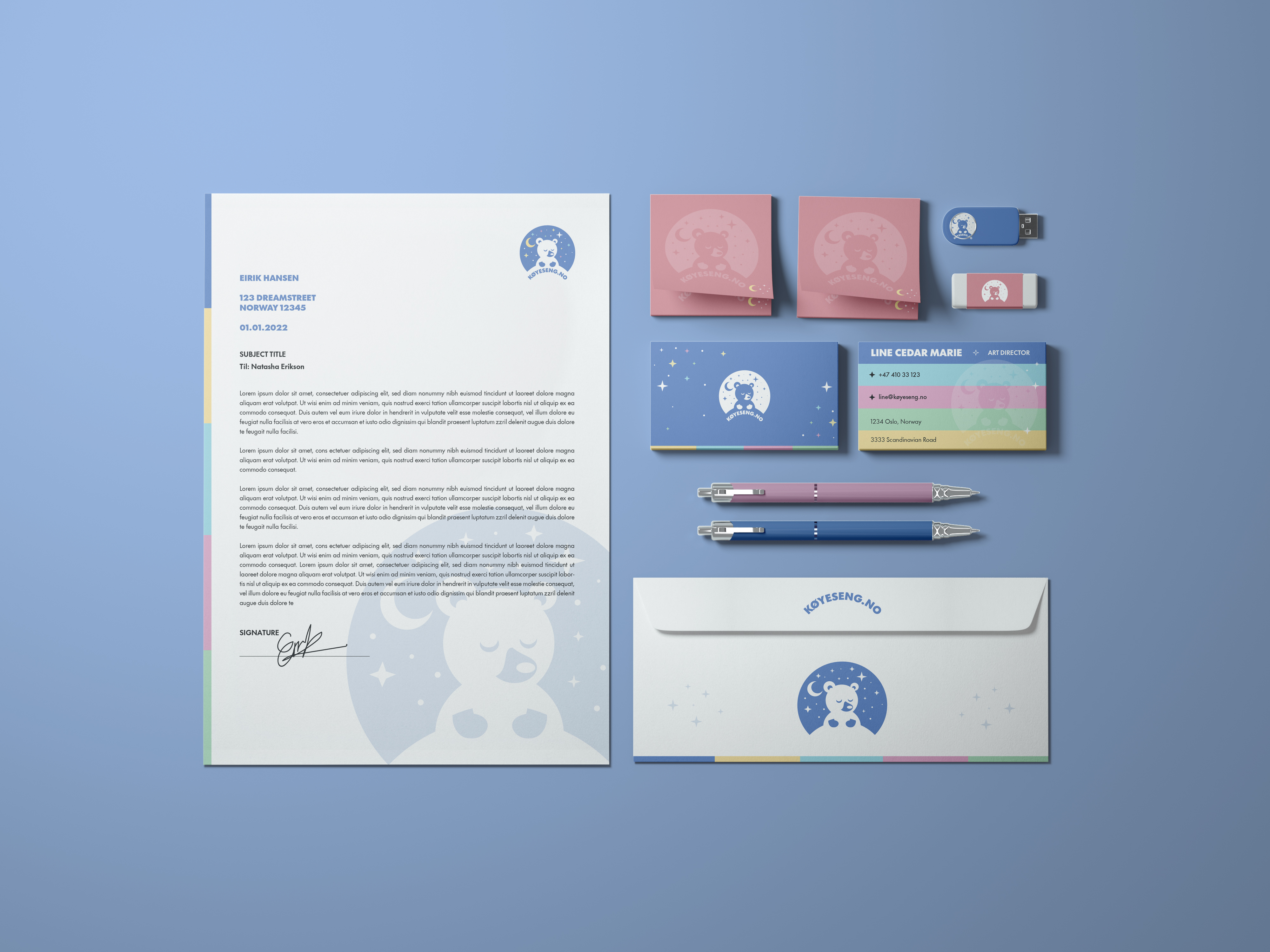 The new visual identity for Køyeseng.no is seamlessly integrated across all brand touch-points, including the presentation layout, brand manual, business cards, various marketing collateral, and merchandise. This ensures a cohesive and professional brand experience, reinforcing brand recognition and awareness.