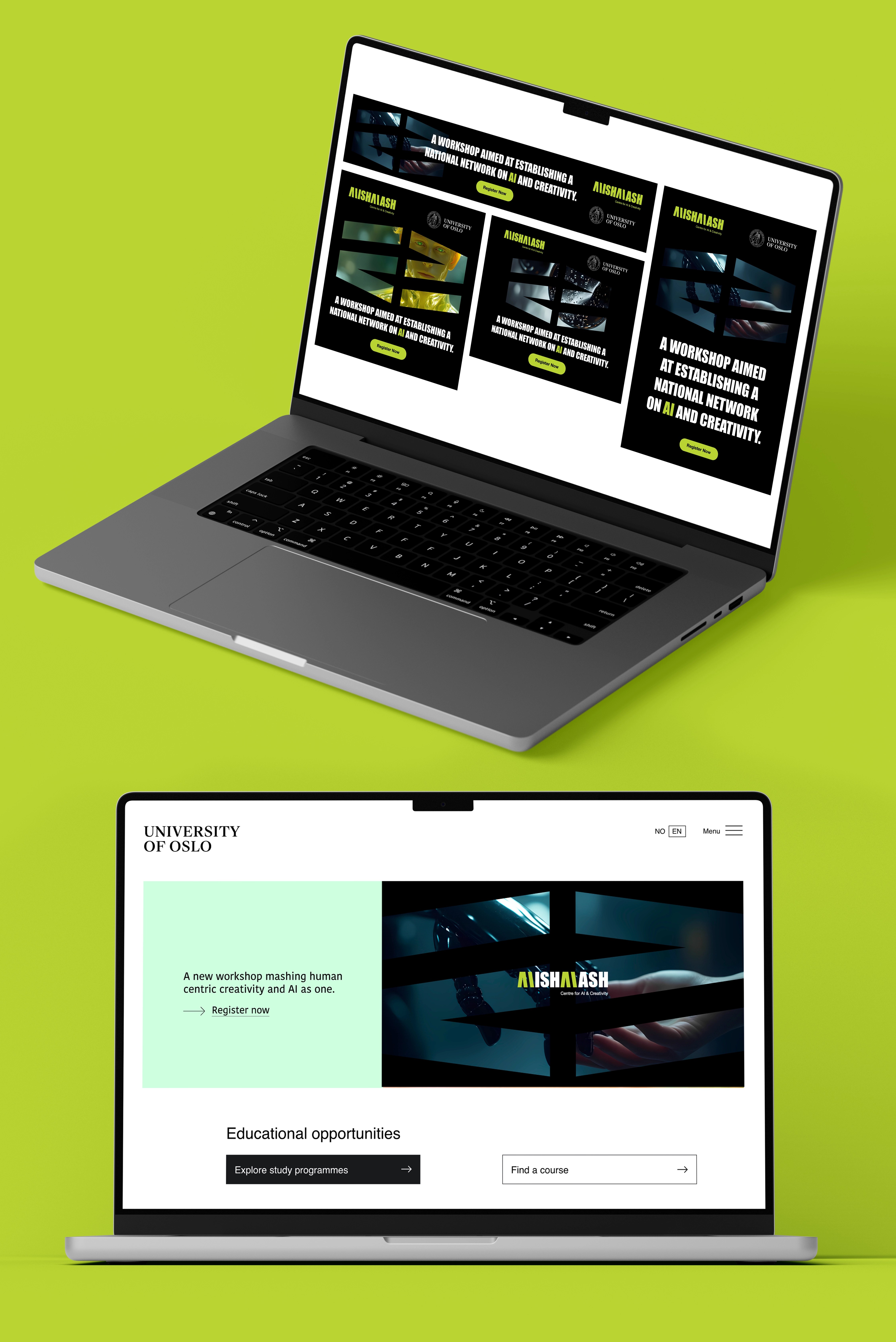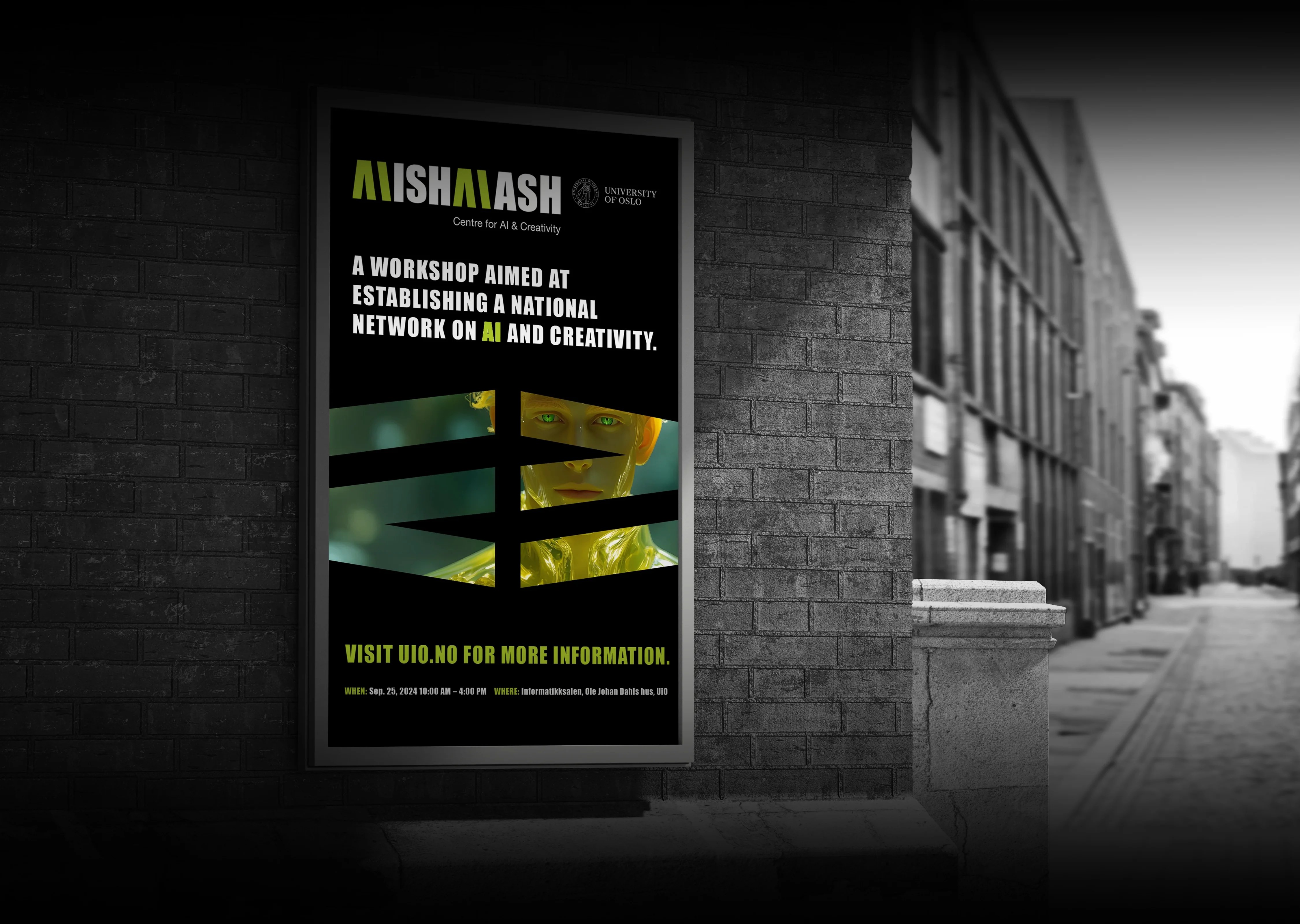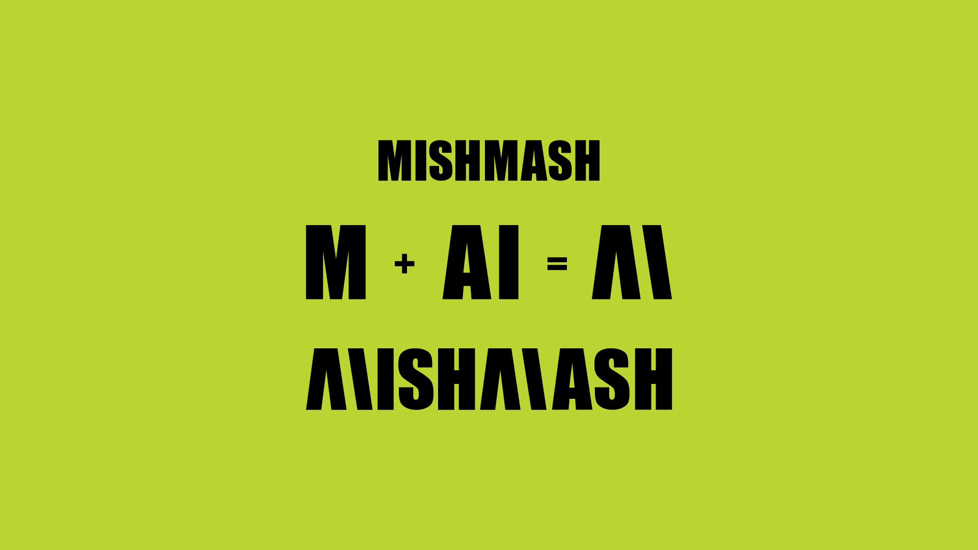 To visually emphasize the AI-driven focus of the “MishMash” workshop, I developed a typographic concept that merges the letter “M” with the embedded initials “A” and “I”. The resulting symbol functions as a unified monogram that subtly integrates ‘AI’ within the structure of the ‘M’, reflecting the fusion of artificial intelligence and creative thinking. This custom letterform also serves as the primary icon for the workshop’s identity, and when rotated sideways, it evokes the appearance of human-written HTML code, an intentional nod to the intersection of design and machine logic. The overall branding strategy balances generative AI tools with traditional design methods, visually capturing the dialogue between human intuition and machine innovation.