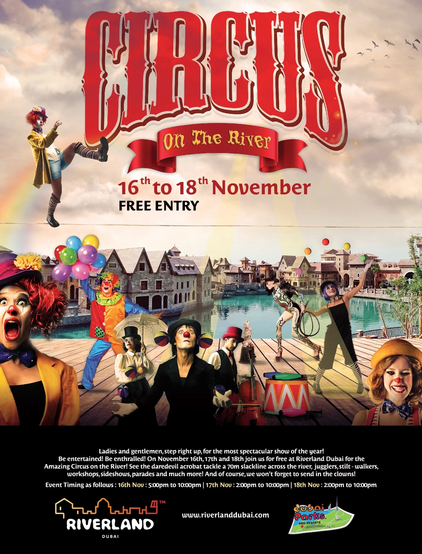A lively circus-themed carnival event, featuring clowns, jugglers, fresh popcorn tents and stilt walkers, will be held by the river.