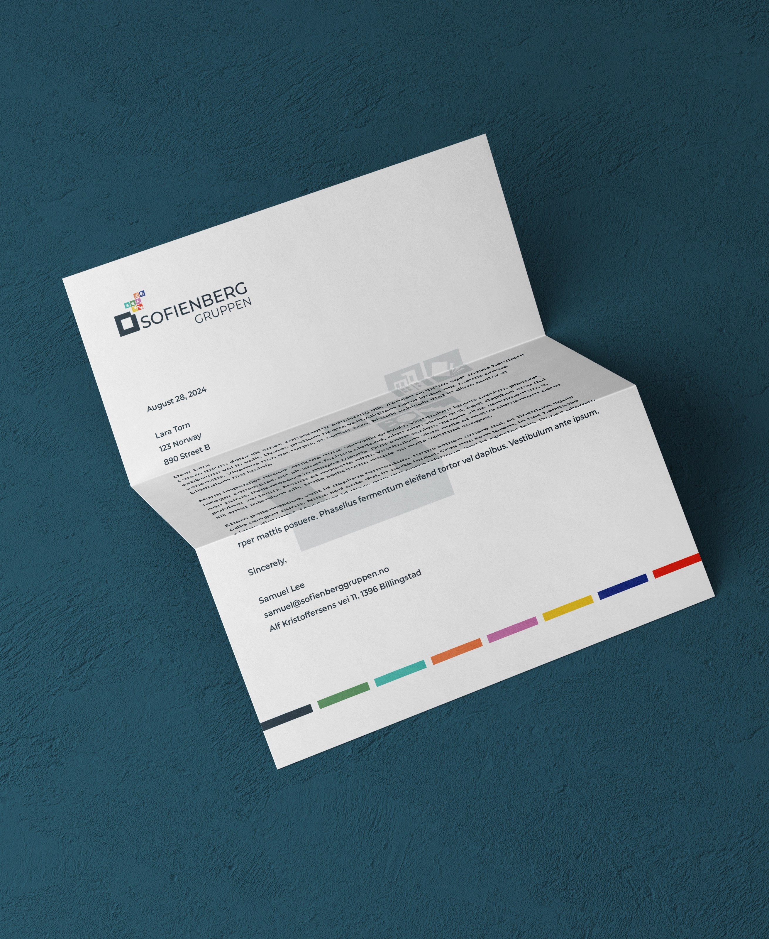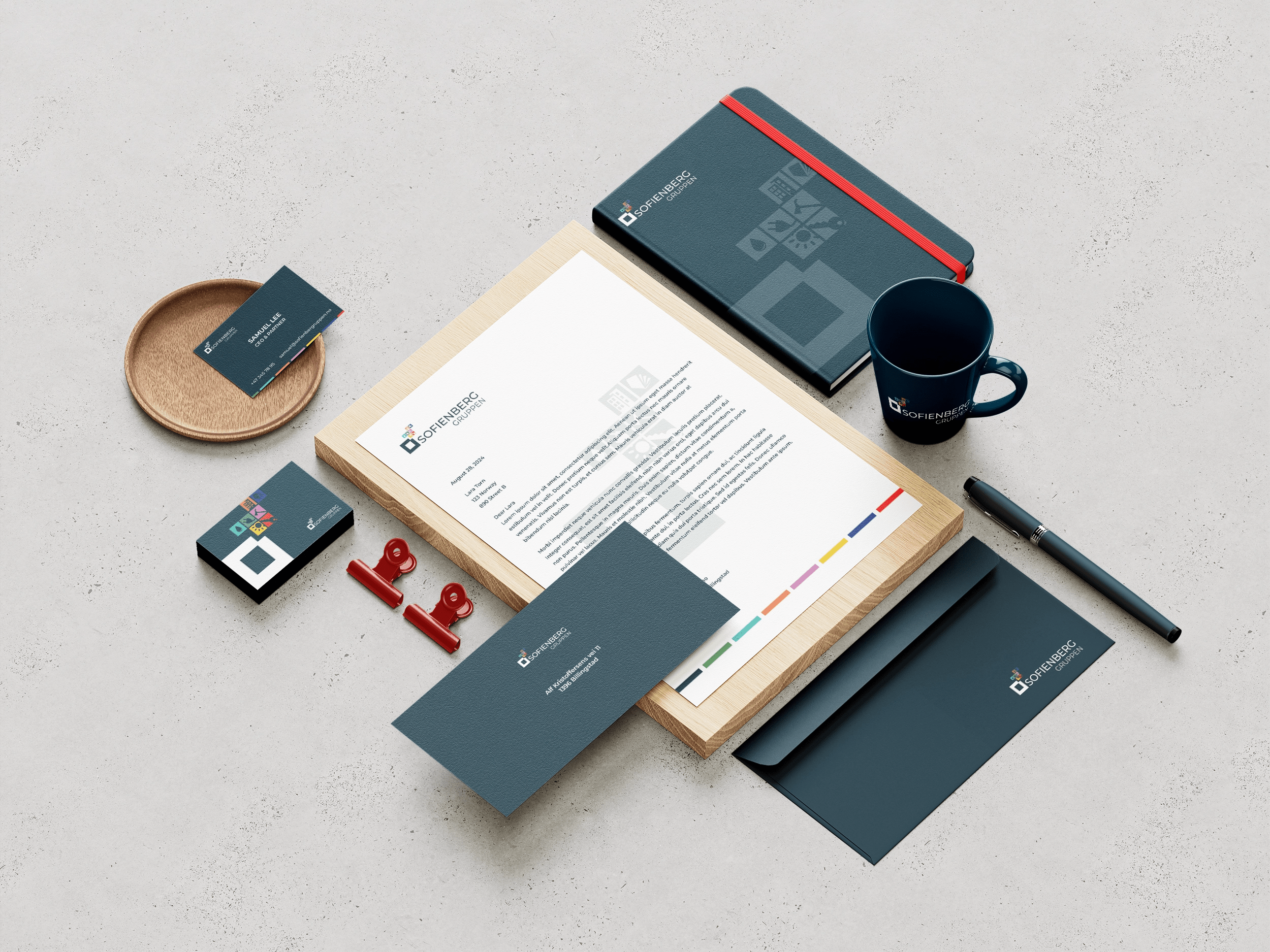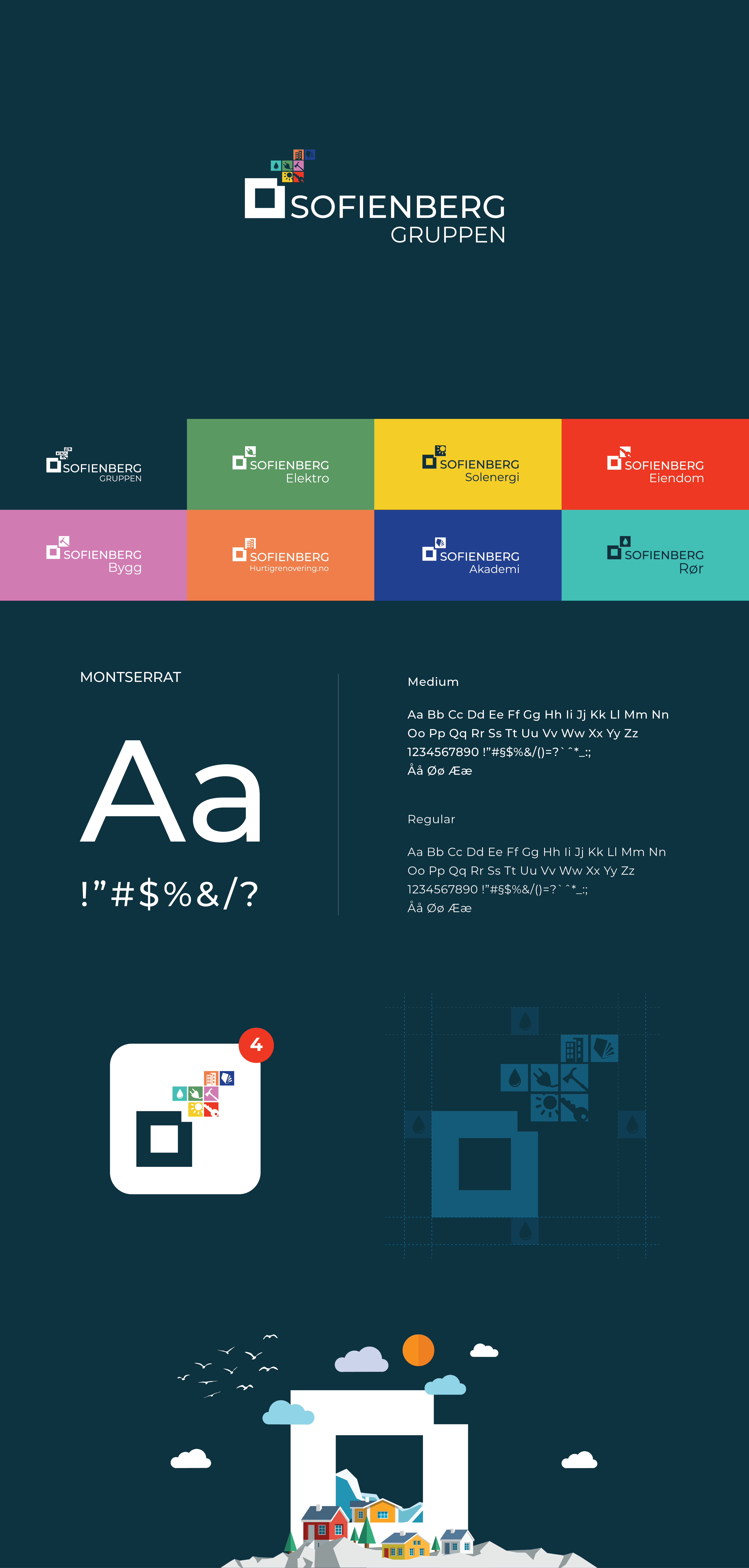 The company is divided into seven entities, each serving a different sector, collectively forming Sofienberg Gruppen (Sofienberg Group). To unify these sectors under a cohesive identity, I developed a design strategy where each sector is represented by a unique color. When combined, these colors form the complete group identity, much like building blocks or Tetris. This visual identity is applied across various print as well as digital formats.