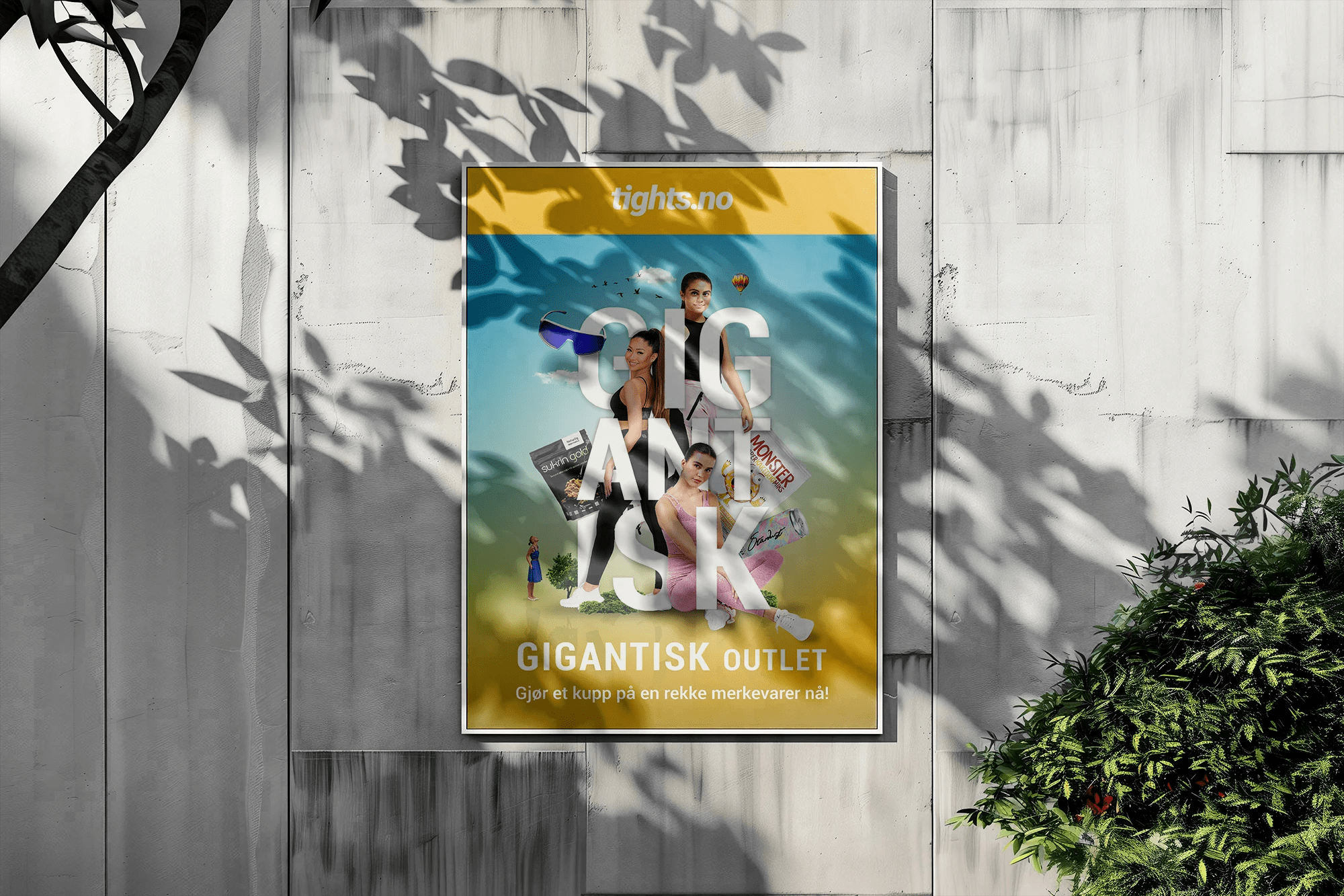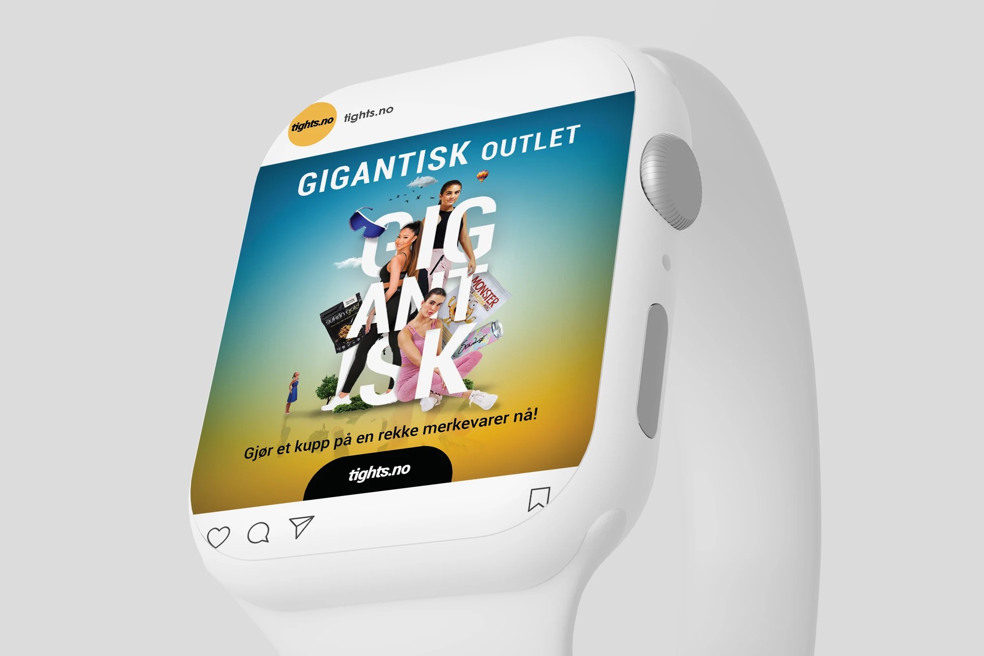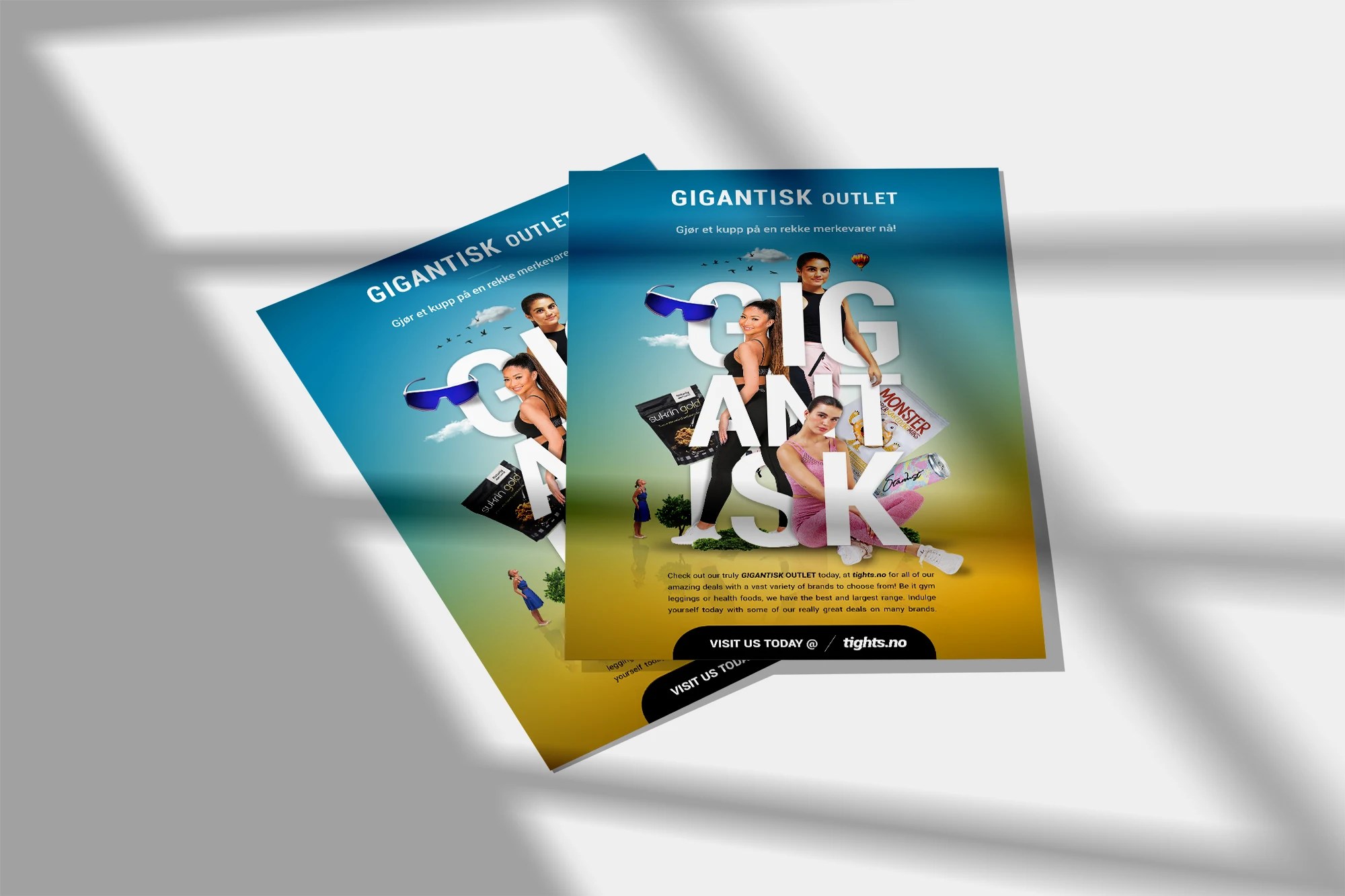 To amplify the impact of Tights.no’s “GIGANTISK OUTLET” online sale, I used a bold, attention-grabbing typeface to emphasize the scale of the promotion. To further enhance the concept, I incorporated a dynamic visual composition where various featured sale items wrapped around the typography, reinforcing the idea of abundance and variety.