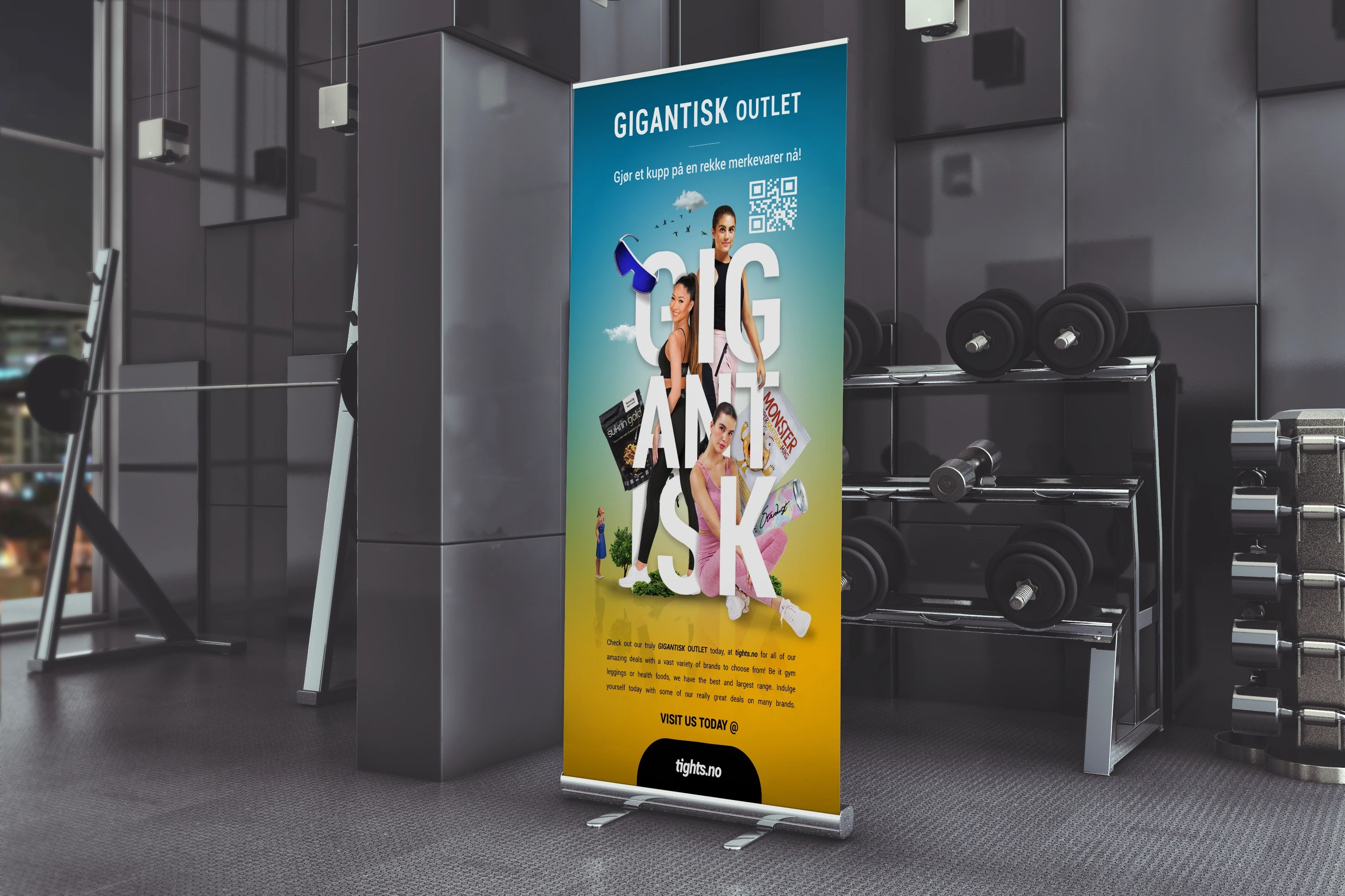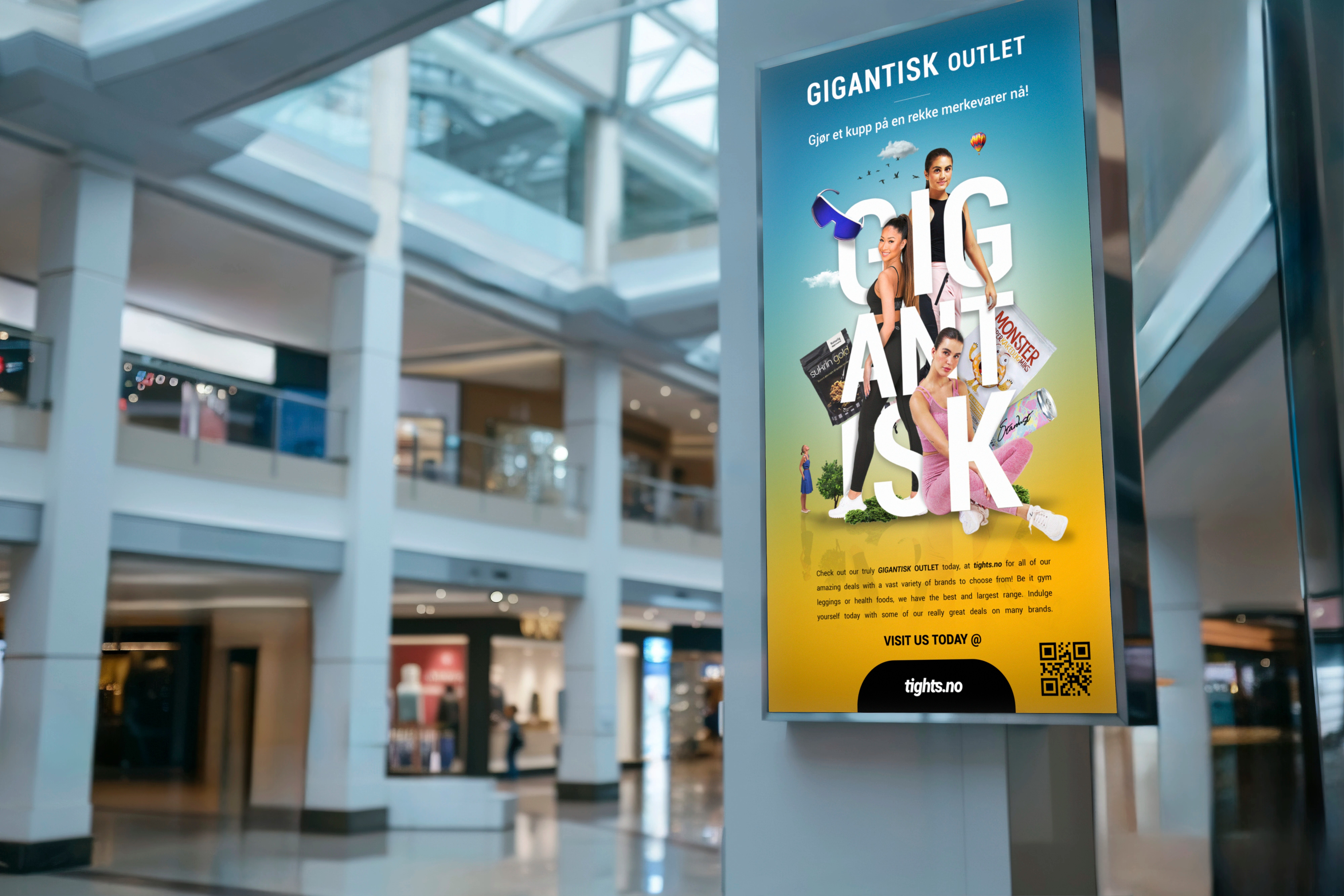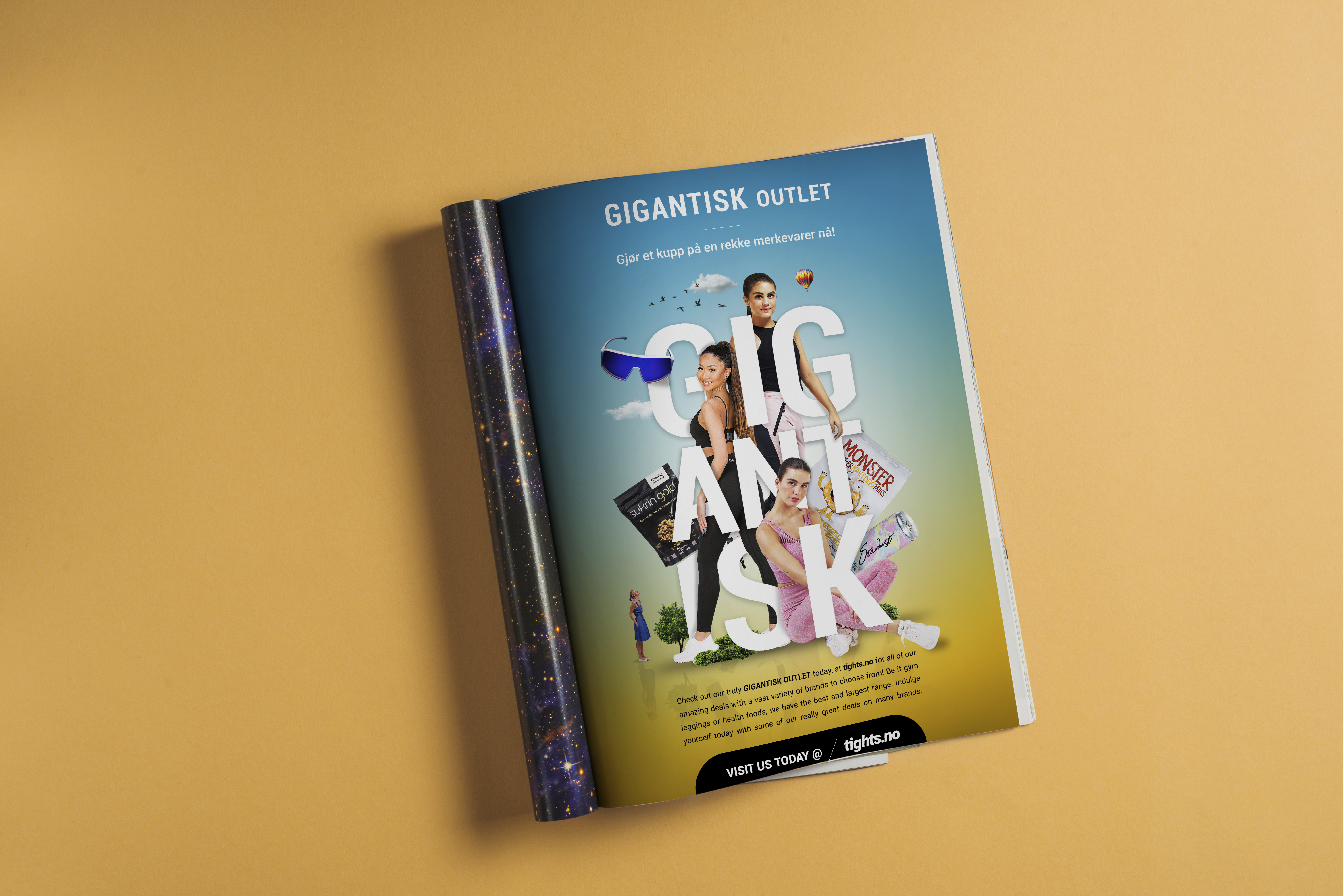 To amplify the impact of Tights.no’s “GIGANTISK OUTLET” online sale, I used a bold, attention-grabbing typeface to emphasize the scale of the promotion. To further enhance the concept, I incorporated a dynamic visual composition where various featured sale items wrapped around the typography, reinforcing the idea of abundance and variety.