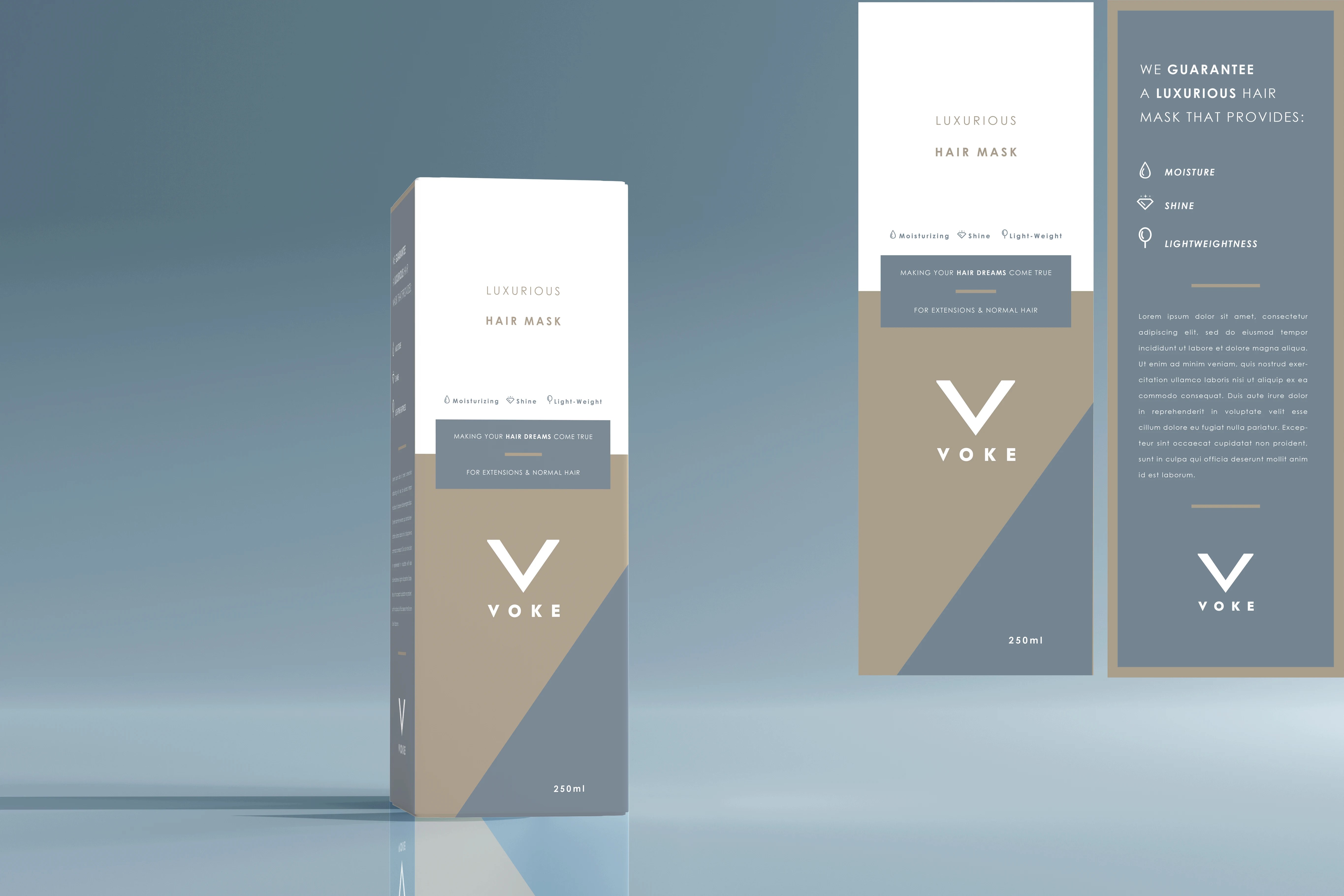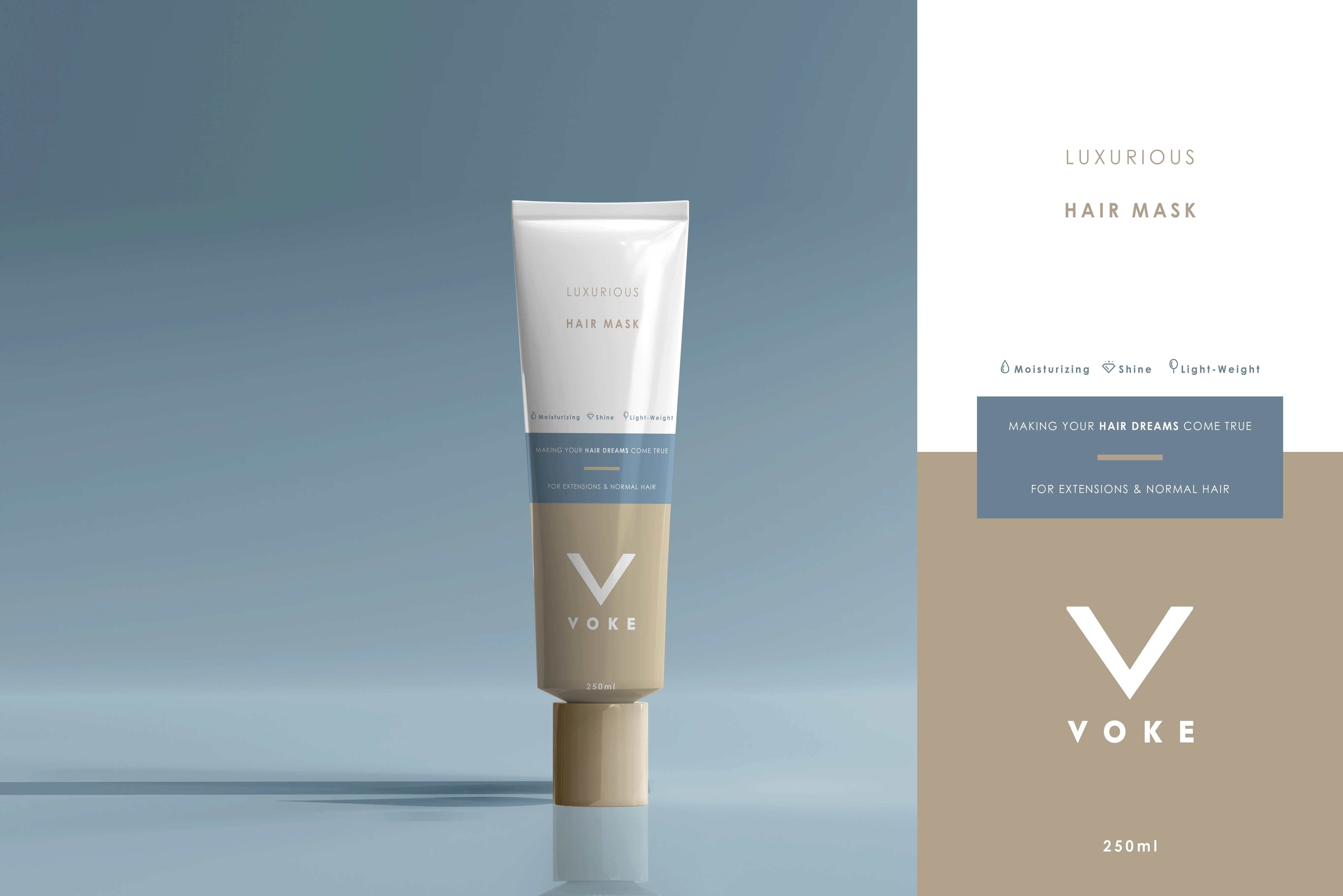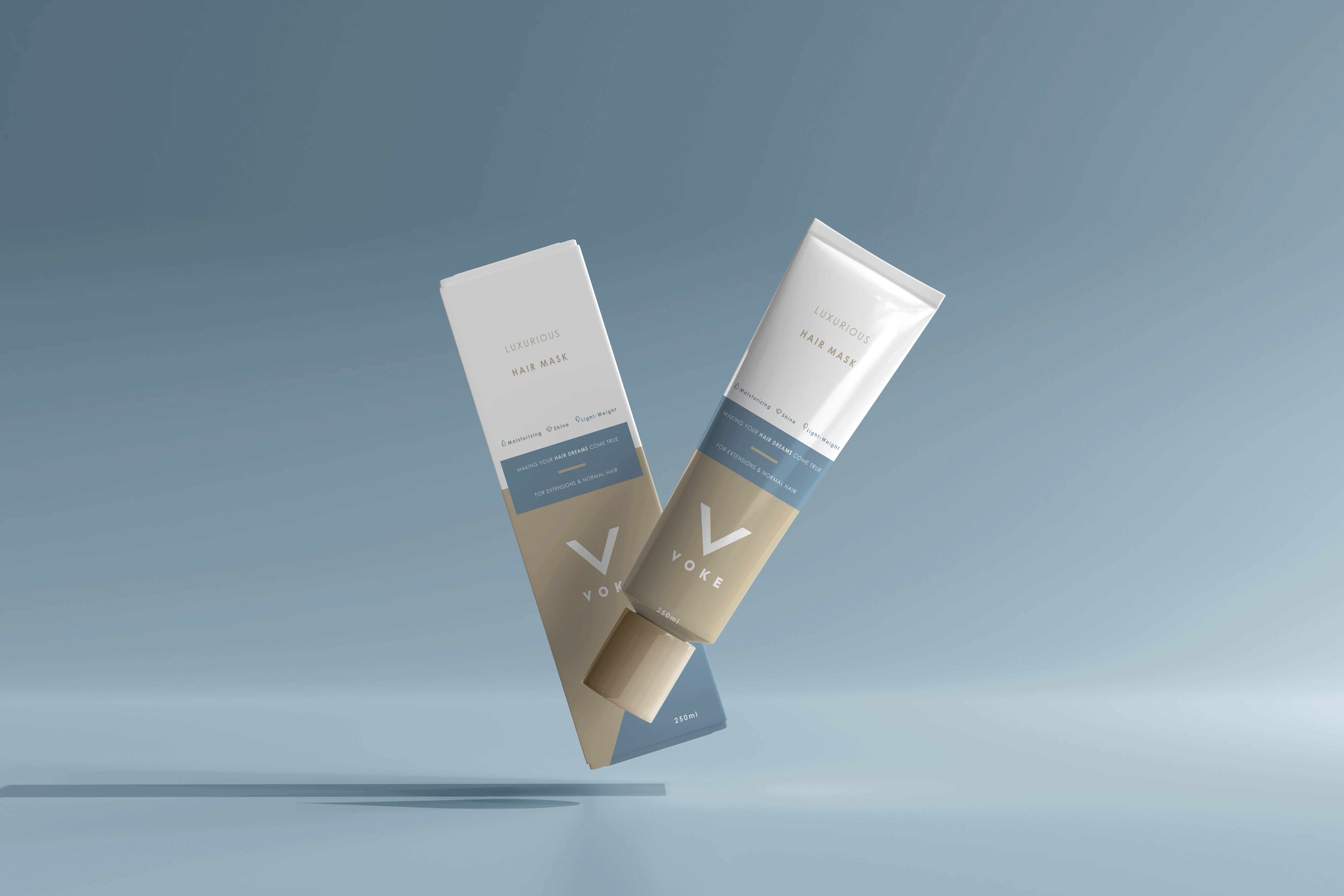 Gold and blue hues were chosen to create a sleek, modern colour palette for the packaging and product design and labels. A color blocking technique was applied to the design of the hair mask tube, and these colors were later incorporated into the overall key strategy to maintain a cohesive brand identity.
